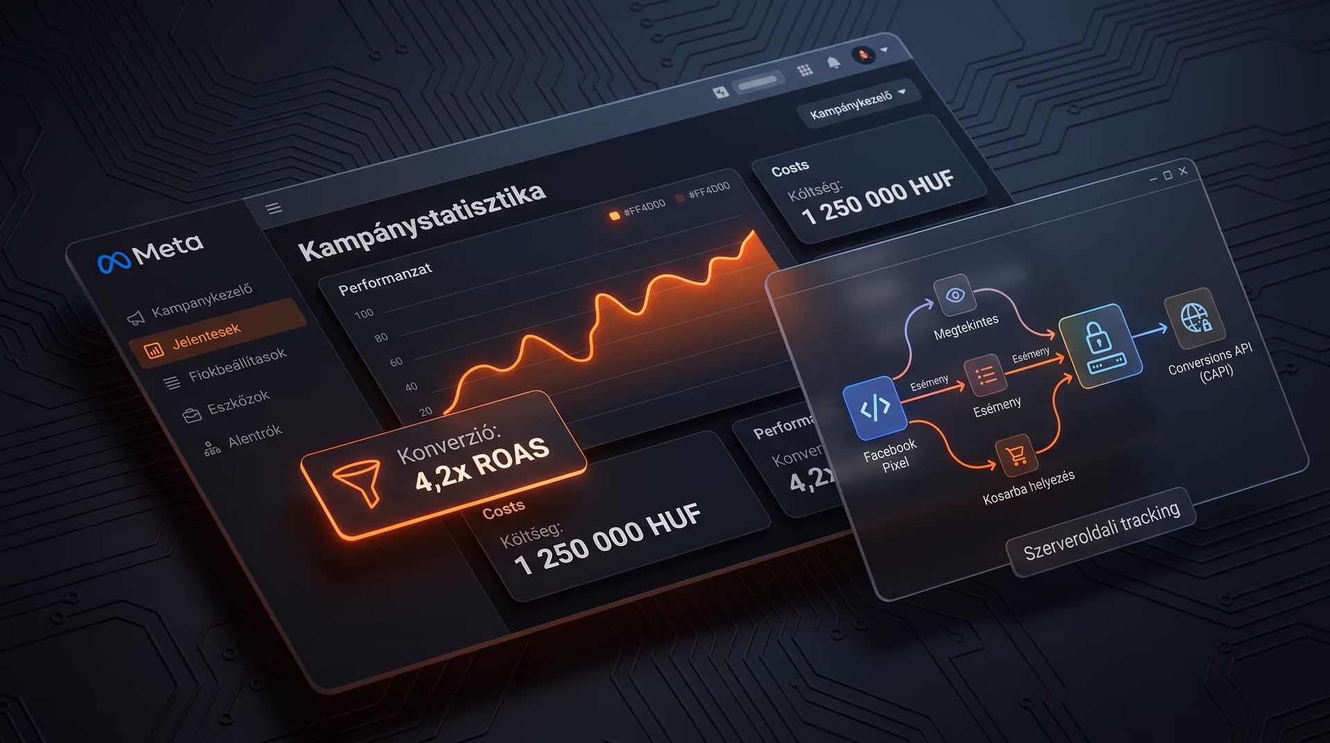A Meta Conversions API (CAPI) szerveroldali megoldás: a webshop vagy weboldal backend-je közvetlenül a Meta Graph API-ra küldi el a konverziós eseményeket (Purchase, Lead, AddToCart, ViewContent). A szerveroldali tracking 80-95%-ban visszanyeri az iOS mérési veszteséget. A helyes implementáció négy pillére: